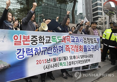 △ '독도 왜곡 교과서 검정발표 규탄한다' (서울=연합뉴스) 윤동진 기자 = 6일 오후 서울 종로구 일본대사관 앞에서 열린 기자회견에서 독도살리기 국민운동본부 회원들이 일본 중학교의 독도왜곡교과서 검정발표를 규탄하는 구호를 외치고 있다.