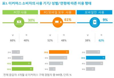 PC만을 이용하는 온라인 소비자 가운데 70%는 40-50대인 반면, PC와 모바일을 모두 사용하는 소비자의 65%는 20~30대였다. 젊을수록 모바일 구매가 활발하다는 뜻이다.