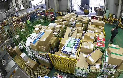 △ 인천공항세관검사장에 쌓여 있는 해외직구 물품들. (연합뉴스 자료사진)