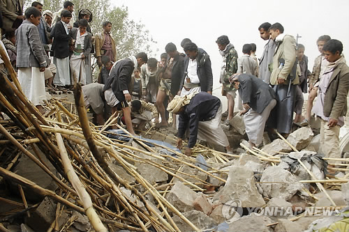 | △ "여기 누가 있는 것 같아" (AP=연합뉴스) 사우디아라비아 주도의 아랍권 동맹국이 4일(현지시간) 예멘의 시아파 반군 후티가 장악하고 있는 수도 사나 일대에 강력한 공습을 감행한 가운데 사나 인근 주민들이 공습으로 파괴된 주택의 잔해 속에서 생존자 수색작업을 펼치고 있다. marshal@yna.co.kr |