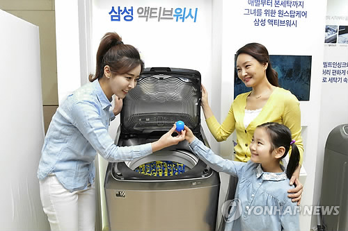 (서울=연합뉴스) 옥철 기자 = 삼성전자[005930]는 8일 서울 강남구 논현동 파티오나인에서 애벌빨래와 본 빨래를 한 번에 하는 신개념 세탁기 '액티브워시' 체험단 발대식을 했다.