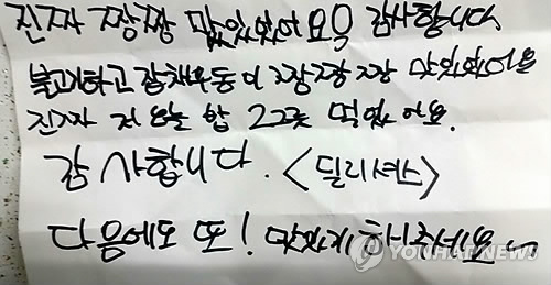 △ 배달 도시락에 남긴 감사 편지 (전주=연합뉴스) 홍인철 기자 = 엄마가 새벽 일찍 일을 나가는 바람에 제대로 아침밥을 챙겨 먹지 못한 승준(13·가명)이는 27일 전북 전주시가 제공하는 도시락을 먹고 나서 짤막한 감사의 글을 남겼다. 2014.10.27 <<지방기사 참조>>. DB. ichong@yna.co.kr