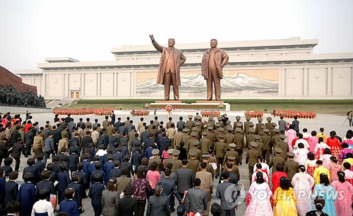 | △ 북한 태양절 참배객들 (평양 조선중앙통신=연합뉴스) 김일성 주석의 생일인 '태양절'을 맞아 인민군장병들과 각계층 근로자들,청소년학생들 꽃바구니를 진정했다고 조선중앙통신이 15일 보도했다. 2014.4.16 photo@yna.co.kr |