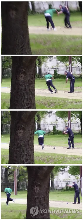 △ '노스찰스턴' 흑인 총격피살 과정 (AP=연합뉴스) 미국 사우스캐롤라이나 주(州) 노스찰스턴의 백인 경관 마이클 토머스 슬레이저(33)가 7일(현지시간) 비무장 흑인 월터 라머 스콧(50)을 총으로 쏴 숨지게 해 살인 혐의로 기소됐다. 슬레이저는 지난 4일 오토바이를 타고 가던 스콧을 교통위반으로 단속하던 중 달아나던 그에게 총격을 가한 것으로 조사됐다. 스콧의 변호인이 제공한 동영상에서 캡처한 것으로, 슐레이저(왼쪽)가 스콧에게 총격을 가하기 까지 과정을 보여주고 있다.