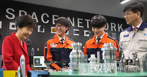 | △ 학생들이 만든 기계 설명듣는 박 대통령 (창원=연합뉴스) 도광환 기자 = 박근혜 대통령이 9일 오전 경남창원과학기술진흥원에서 열린 경남창조경제혁신센터 출범식에 참석, 창원기계공고 학생들이 만든 기계에 대해 설명듣고 있다. 2015.4.9 dohh@yna.co.kr |