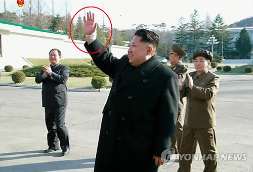 △ 북한 김정은, 오른 손목에 부상…거즈와 반창고 붙여 (서울=연합뉴스) 평양약전기계공장을 방문해 공장 직원들을 향해 손을 흔드는 김정을 국방위원회 제1위원장의 오른손 손목 부분에 흰색거즈와 반창고가 붙어 있다. 작년 발목에 이어 또 부상을 입은 것으로 보인다.