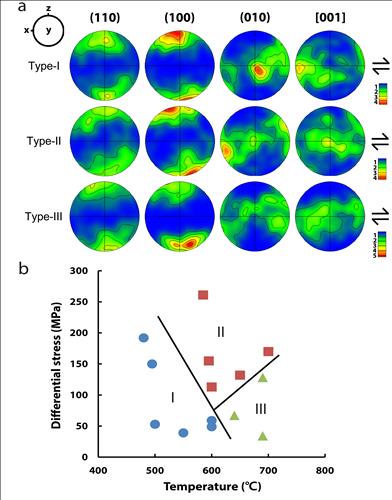 | △ 각섬암이 고압고온에서 변형될 때 각섬석의 배열이 온도와 응력의 세기에 따라 세 가지 타입(type-I, -II, -III)으로 나타남을 각섬암 변형실험을 통해 발견했다. 압력=1GPa(1만 기압, 지하 30km 깊이의 압력), 온도=480∼700℃ |
