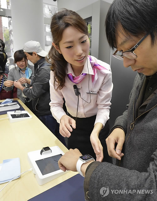 △ 애플워치 온라인 선주문 개시 (도쿄 교도=연합뉴스) 10일 일본 도쿄 오모테산도 소프트뱅크 매장에서 한 시민이 온라인 선주문이 시작된 애플워치를 차보고 있다. 애플워치는 10일부터 미국, 영국, 호주, 캐나다, 중국, 프랑스, 독일, 홍콩, 일본 등 9개국에서 선주문이 가능하며 24일부터 매장에서 정식으로 판매될 예정이다. 한국 판매는 아직 미정이다. 2015.4.10 photo@yna.co.kr