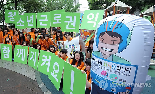 | △ 청소년 근로권익 다함께 지켜요! (서울=연합뉴스) 이정훈 기자 = 서울 마포구 서교동 홍익어린이공원에서 고용노동부 제4기 알바지킴이 청소년리더들이 청소년 근로권익 보호를 위한 가두캠페인을 하고 있다. (연합뉴스 자료사진) |