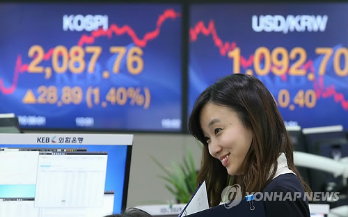 | △ 코스피지수가 전날보다 28.89포인트(1.40%) 오른 2,087.76으로 거래를 마감한 10일 오후 서울 중구 명동 외환은행 본점 딜링룸에서 한 딜러가 활짝 웃으며 대화를 나누고 있다. |