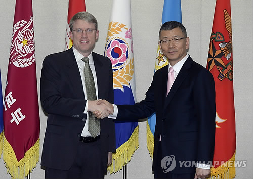 △ 한·미 통합국방협의체 회의 (서울 사진공동취재단=연합뉴스) 17일 서울 용산구 국방부에서 열린 제6차 한·미 통합국방협의체(KIDD)회의에서 한국측 대표 류제승 국방정책실장(오른쪽)과 미국측 대표 데이비드 헬비 동아시아부차관보가 악수하고 있다. 2014.9.17 photo@yna.co.kr