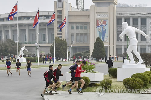 △ 북한 마라톤대회에 외국인 650명 참가…작년의 3배 (평양 교도=연합뉴스) 북한이 올해 평양에서 주최한 국제마라톤대회에 예상보다 훨씬 많은 650명 규모의 외국인 선수들이 참가했다고 교도통신이 12일 보도했다. 북한 당국이 6개월여간의 에볼라 바이러스 차단을 위한 입국 제한조치를 지난달 대폭 해제한 덕분으로 풀이된다. 사진은 마라톤대회를 앞두고 11일 평양 김일성경기장 앞에서 연습하는 선수들. <<국제뉴스부 기사 참조>> 2015.4.12 chungwon@yna.co.kr