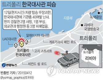 외교부와 현지 언론 등에 따르면 이날 오전 1시20분께 차를 타고 지나가던 무장 단체가 트리폴리 한국 대사관 앞에서 기관총 40여발을 난사해 경비초소에서 근무 중이던 리비아 내무부 소속 외교단 경찰관 3명이 총탄에 맞았다.