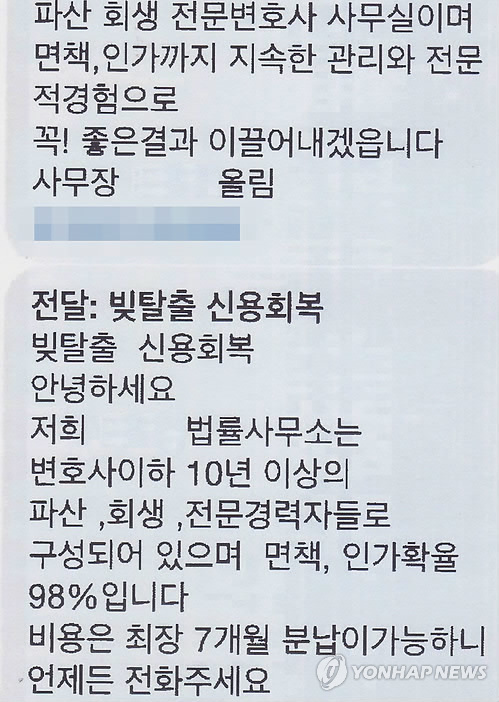 △ 보따리 사무장이 보낸 파산회생 문자메시지 (부산=연합뉴스) 변호사 없이 사건 수임에 나서는 속칭 '보따리 사무장'이 보낸 문자메시지. 부산지방변호사회는 이런 보따리 사무장의 행태가 시민들에게 큰 피해를 일으킬 수 있다며 이들 사무장과 계약관계에 있는 변호사와 법무법인을 검찰에 고발했다. 2015.4.12 << 부산지방변호사회 >> osh9981@yna.co.kr