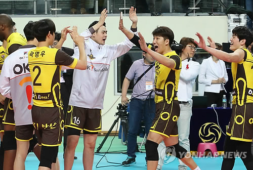 △ '우리가 최강' (서울=연합뉴스) 서명곤 기자 = 12일 오후 서울 중구 장충동 장충체육관에서 열린 '2015 IBK기업은행 한·일 V리그 톱매치' 남자부 OK저축은행과 일본 JT 선더스의 경기에서 세트스코어 3-2로 승리한 OK저축은행 선수들이 기뻐하고 있다. 2015.4.12 seephoto@yna.co.kr