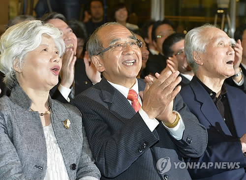 | △ 일본 지방선거 여당 승리…아베 장기집권 가능성 커져 (오이타 교도=연합뉴스) 일본 지방선거에서 자민·공명 연립여당이 승리했다. 12일 치러진 10개 광역지자체장 선거에서 연립여당의 후보와 제1야당인 민주당 후보가 대결한 홋카이도(北海道)와 오이타(大分)현 지사로 연립여당이 추천한 후보의 당선이 확정됐다. 사진은 오이타현 지사 선거에서 자민당과 공명당의 추천을 받은 히로세 가쓰사다(廣瀨勝貞, 가운데 안경 쓴 이) 현직 지사가 민주당 계열인 구기미야 반(釘宮磐) 전 오이타 시장을 큰 표차로 꺾고 당선됐다는 소식을 전하는 TV 화면을 보면서 손뼉을 치는 모습. << 국제뉴스부 기사 참조 >> 2015.4.13 chungwon@yna.co.kr |