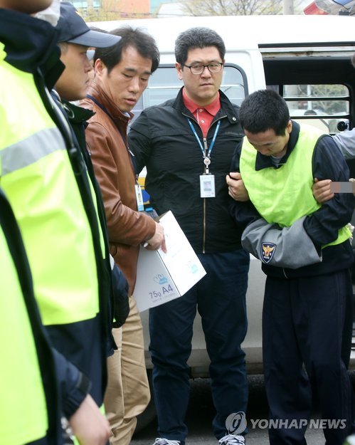 오전 10시께 호송차가 멈추자 수갑을 찬 채 포승줄에 묶인 김씨가 형사들의 손에 이끌려 차에서 내렸다.