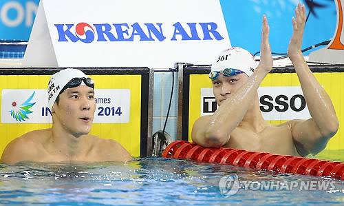 | △ 2014 인천 아시안게임 수영 남자 자유형 1,500m 결승에서 중국의 쑨양이 1위로 레이스를 마친 뒤 4위 박태환에게 박수를 쳐 달라고 팬들을 유도하던 모습.(연합뉴스 DB) |