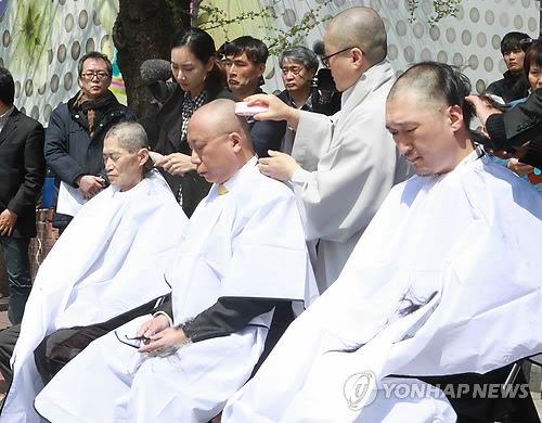 | △ 삭발하는 서울연극제 집행위 (서울=연합뉴스) 박정헌 기자 = 13일 오후 서울 종로구 대학로 아르코예술극장 앞에서 열린 '2015 제36회 서울연극제집행위원회 긴급 기자회견'에서 김태수 서울연극제 집행위원 감사(왼쪽부터), 박장렬 서울연극제 집행위원장, 공재민 서울연극제 집행위원회 사무처장이 아르코예술극장 대극장의 일방적 폐관 통보에 항의하며 삭발을 하고 있다. 2015.4.13 home1223@yna.co.kr |