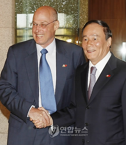 △ 2008년 왕치산 당시 중국 부총리와 만났을 때의 헨리 폴슨 전 미국 재무장관 - 자료사진
