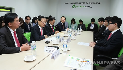 | △ 최경수 한국거래소 이사장, 상장유치를 위한 기업방문 (서울=연합뉴스) 최경수 한국거래소 이사장(왼쪽 두 번째)이 13일 오후 코스닥시장 상장 유치를 위해 비상장사인 서울 강남구 ㈜더블유게임즈를 방문, 기업상장의 필요성 및 이점 등을 설명하고 상장준비 과정에서의 애로사항을 청취하고 있다. (한국거래소 제공) |