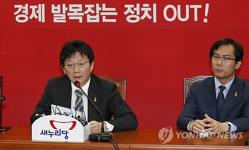 △ 새누리당 유승민 원내대표가 14일 오후 국회에서 긴급 최고위원회의 결과를 취재진에게 설명하고 있다.