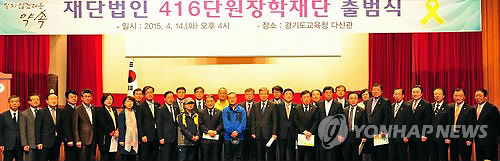 | △ 세월호 희생학생·교사 꿈계승 단원장학재단 첫발 (수원=연합뉴스) 세월호 사고 희생 학생과 교원의 생전 꿈을 계승하고 넋을 기리는 '4·16 단원장학재단'이 14일 출범식을 갖고 첫발을 내디뎠다. 사진은 출범식 후 참석자들이 기념사진을 촬영하는 모습. 2015.4.14 <<경기교육청 제공>> young86@yna.co.kr |