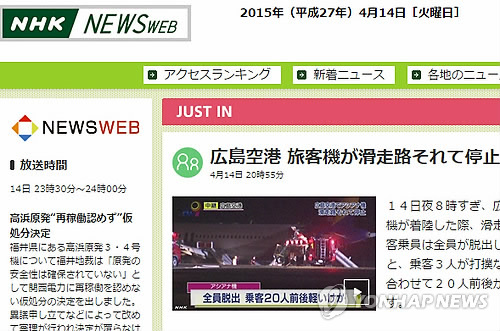 | △ 아시아나기 히로시마 공항서 활주로 이탈 (서울=연합뉴스) 14일 아시아나항공 여객기가 일본 히로시마(廣島) 공항에 착륙하면서 활주로를 벗어나는 사고가 발생, 23명이 부상했다고 교도통신이 보도했다. 오후 6시49분 인천공항을 출발한 아시아나항공 162편(에어버스 A320기)은 오후 8시께 히로시마 공항에 착륙한 뒤 활주로를 벗어나 정지했다. 사진은 히로시마 공항서 활주로 이탈한 아시아나기 소식을 전하는 NHK 보도. (일본 NHK NEWS 홈페이지 캡처) |