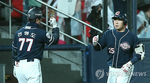 | △ 두산 양의지 솔로홈런 (수원=연합뉴스) 신영근 기자 = 14일 경기도 수원케이티위즈파크에서 열린 프로야구 케이티와 두산의 경기 4회초 두산 양의지가 솔로홈런을 때린 뒤 전형도 주루코치의 축하를 받고 있다. 2015.4.14 drops@yna.co.kr |