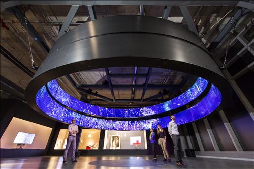 삼성전자는 65인치 SUHD TV 36대를 연결해 만든 지름 10m의 거대한 링 2개를 공중에 매달아 오브제(상징물)처럼 전시했다.