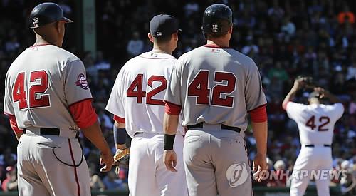 | △ 15일(현지시간) 메이저리그 첫 흑인 선수인 재키 로빈슨을 기리는 '재키 로빈슨 데이'를 맞아 워싱턴과 보스턴 선수들이 그의 등번호인 42번을 달고 뛰고 있다. |