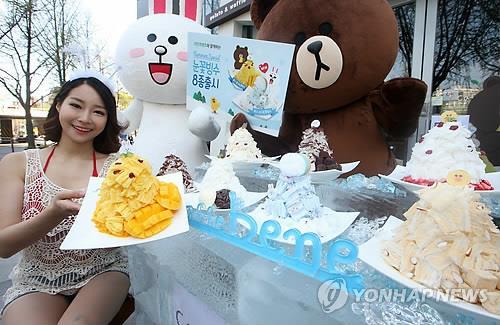 네이버 모바일 메신저 '라인'(LINE)의 인기 캐릭터 브라운, 코니, 샐리를 초코판 토핑으로 만들어 올려놓은 빙수 8종을 최근 출시한 것이다.