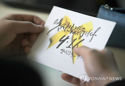 | △ '잊지 않겠습니다' (서울=연합뉴스) 윤동진 기자 = 세월호참사 1주기인 16일 오전 서울 강동구 선사고등학교에서 한 학생이 유가족들에게 보낼 엽서를 들고 있다. 2015.4.16 mon@yna.co.kr |