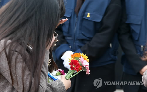 | △ 꽃 들고 조문 순서 기다리는 단원고 학생들 (안산=연합뉴스) 신영근 기자 = 세월호 참사 1주년인 16일 오전 경기도 안산시 단원구 세월호 희생자 정부 공식 합동분향소를 찾은 단원고등학교 학생들이 조문 순서를 기다리며 울먹이고 있다. 2015.4.16 drops@yna.co.kr |