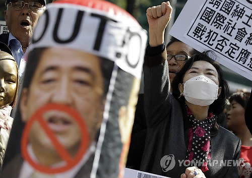 | △ Protesters shout slogans during a rally against Japanese Prime Minister Shinzo Abe's policy about South Korean wartime sex slaves from the Japanese government in front of the Japanese Embassy in Seoul, South Korea, Wednesday, April 1, 2015. (AP Photo/Lee Jin-man) |