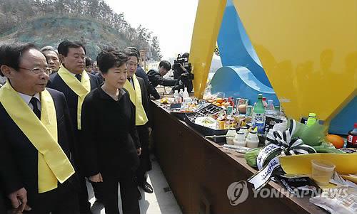 △ 팽목항 방문한 박 대통령 (진도 청와대사진기자단=연합뉴스) 박근혜 대통령이 세월호 1주년을 맞은 16일 오후 전남 진도군 팽목항을 방문, 희생자와 실종자를 위해 마련된 추모 메시지와 음식들이 놓인 단 앞을 지나가고 있다. 2015.4.16 dohh@yna.co.kr (끝)