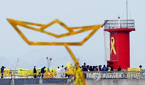 진도 팽목항에서는 아이들의 꿈을 앗아간 세월호가 잠들어 있는 야속한 바다를 바라보며 추모식이 열렸다.