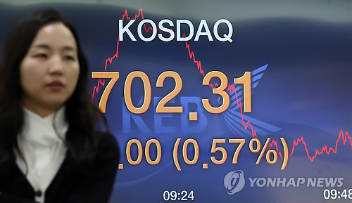 △ 코스닥, 7년 3개월 만에 700선 돌파 (서울=연합뉴스) 이지은 기자 = 코스닥지수가 7년 3개월 만에 장중 700선을 돌파한 17일 오전 서울 중구 외환은행 딜링룸에서 한 직원이 전광판 앞을 지나고 있다.