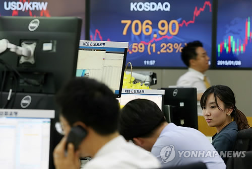 △ 7년 3개월만 700선 돌파한 코스닥 (서울=연합뉴스) 이지은 기자 = 코스닥 지수가 7년 3개월 만에 700선을 돌파한 17일 오후 서울 중구 외환은행 본점 딜링룸에서 직원들이 업무를 보고 있다.