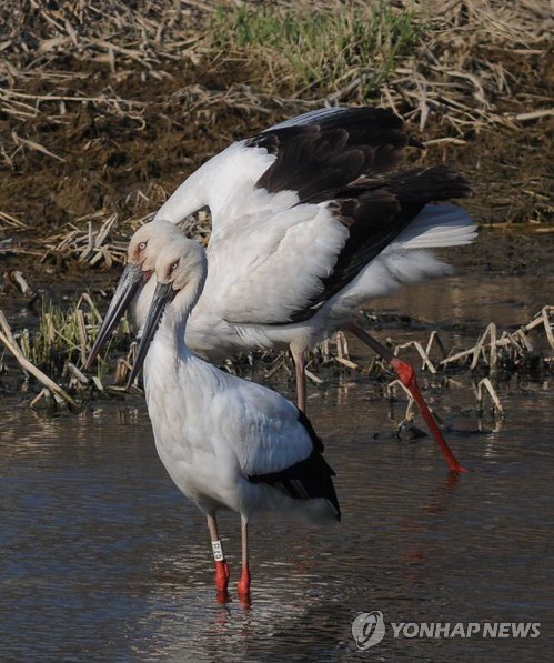 | △ 황새 '미호' 이번엔 진천서 발견 (청주=연합뉴스) 황정현 기자 = 박시룡 한국교원대 황새 생태연구원장은 25일 1년 전 청람 황새공원을 탈출했던 황새 미호가 지난 24일 진천 미호천에서 거니는 모습이 발견됐다고 밝혔다. 최근 청주 옥산 미호천과 충남 천수만 등에서 발견된 뒤 진천에서 발견되면서 '둥지' 주변을 맴도는 황새의 귀소본능이 다시 확인된 셈이다. 'B49'번 인식표를 단 황새 미호는 지난해 4월 사육사가 다리에 인식표를 교체하는 틈을 타 청람 황새공원을 탈출했다. 2015.3.25 <<박시룡 한국교원대 황새 생태연구원장 제공>> sweet@yna.co.kr |