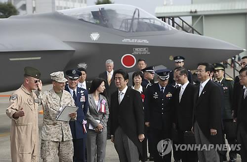 | △ 2014년 10월 26일 햐쿠리 공군기지에서 열린 자위대 창설 60주년 기념행사에서 아베 신조 일본 총리(가운데)가 실물크기의 F35전투기 모형 앞에 서 있는 모습.(AP=연합뉴스DB) |