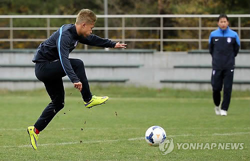 △ 이승우 슈팅 지켜보는 안익수 감독. 18세 이하(U-18) 축구 국가대표팀 이승우가 20일 오전 파주NFC에서 훈련하고 있다. 오른쪽은 안익수 감독 대표팀은 JS파운데이션(이사장 박지성)의 주최로 수원월드컵경기장에서 개최되는 '2015 수원 JS컵 U-18 국제청소년축구대회'에 출전해 오는 29일 우루과이와의 1차전을 시작으로 다음 달 1일과 3일에는 각각 벨기에, 프랑스와 일전을 치른다. 2015.4.20