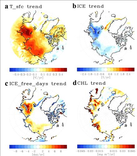 연구진이 실제로 1998∼2013년 북극해 지역별 해수면 온도와 해빙이 녹은 정도, 얼음이 녹아 있는 기간, 바닷물 속 엽록소 변화 등을 분석한 결과 지역별 해수면 온도 상승 추세와 엽록소 변화 등이 거의 정확하게 일치하는 것으로 나타났다.