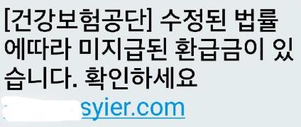 스미싱 문자에는 "[건강보험공단] 수정된 법률에 따라 미지급된 환급금이 있습니다. 확인하세요"라는 문구와 함께 '***syier.com' 등의 인터넷 주소(URL)가 포함돼 있다.