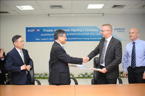 | △ 21일 포스코플랜텍 이준호 부사장과 알스톰 조르겐 코르널 부사장이 복합화력발전 설비 장기공급 협약을 맺었다. |