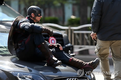 | △ 촬영 중인 크리스 에반스 (서울=연합뉴스) 김수진 기자 = 할리우드 배우 크리스 에반스가 4일 오전 서울 마포구 상암동 DMC 월드컵북로에서 진행된 '어벤져스:에이지 오브 울트론' 촬영장에서 촬영을 준비하고 있다. 2014.4.4 ksujin@yna.co.kr |