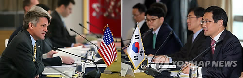 | △ 박노벽 한미원자력협정개정협상 전담대사와 토마스 컨트리맨 미 국무부 국제안보 비확산차관보가 지난해 1월 7일 대전 인터시티호텔에서 만나 한미원자력협정 개정 협상을 하고 있다. (연합뉴스 자료사진) |