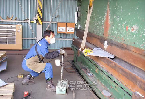△ 소아마비를 앓아 다리가 불편한 장애인이 프레스를 조작하고 있다.(연합뉴스 자료사진)