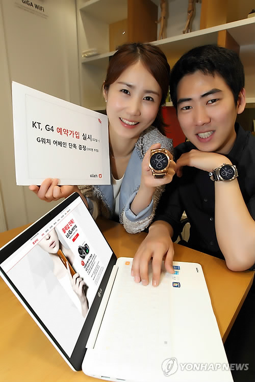 | △ KT, "G4 예약가입하고 스마트워치 받으세요" (서울=연합뉴스) KT가 오는 22일부터 28일까지 올레샵을 통해 LG전자 플래그십 모델인 'G4'의 예약가입을 진행한다고 21일 밝혔다. KT는 예약가입 후 내달 8일까지 G4를 개통시킨 고객 중 100명을 뽑아 LG전자 스마트워치 '어베인(Urbane)'을 경품으로 준다. 또한 2만원 상당의 LG 정품 ‘64GB 외장메모리’와 함께 ‘액정 무상교체 서비스’도 예약가입자 전원에게 지원한다. 2015.4.21 << KT 제공 >> photo@yna.co.kr |