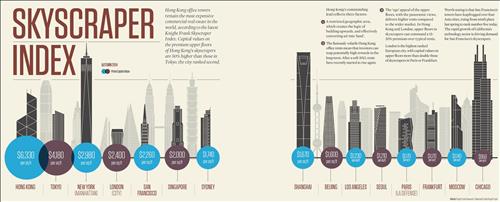 '임대료 최고' 도시는 화려한 스카이라인을 형성하고 있는 홍콩에게 돌아갔다. 임대료가 작년 하반기 11.3% 급등한 탓에 이번 조사에서 2천696달러(약 293만원·이하 ㎡당 가격)를 기록, 2위인 미국 뉴욕을 압도적으로 따돌렸다. 뉴욕의 고층빌딩 임대료도 지난해 7월에 20% 상승했으나 ㎡당 1천615달러로 홍콩보다 66%가량 싼 편이다.